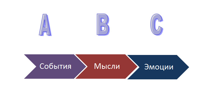 Исходя из этого, «А» — событие которое произошло, «С» — эмоции, а «В» — это те мысли, которые мы часто «пропускаем», но которые неизменно являются истинной причиной наших эмоций!